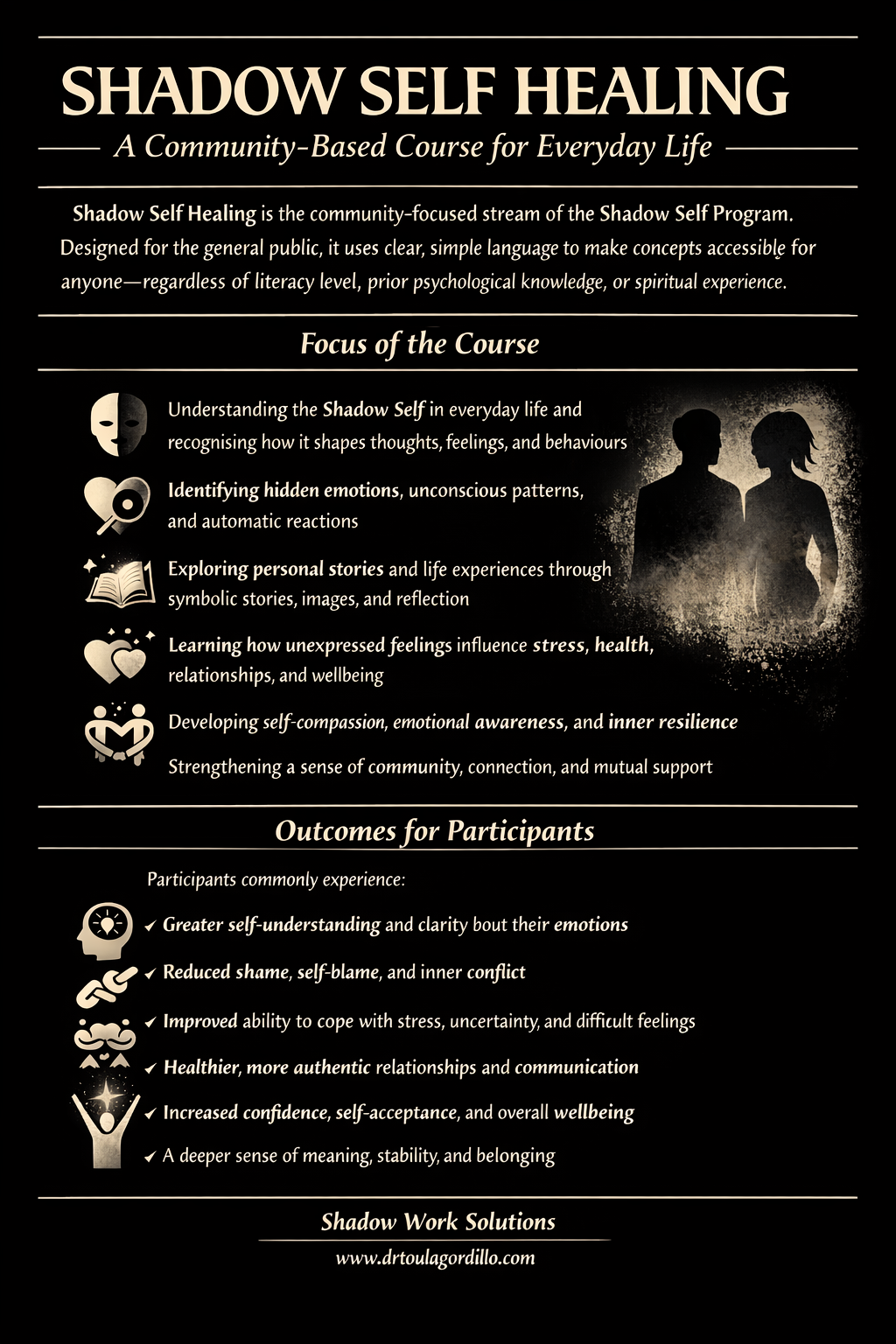 This course in the Shadow Self program is designed for men and women who want to lead themselves or others with greater self-awareness, authenticity and resilience. Shadow Self Leadership is grounded in Story Image Therapy (SIT®) and the psychospiritual work of Dr Carl Jung. It includes heart and head-centred, as well as soul-centred leadership and it uses symbolic stories, images and self-reflection to integrate the unconscious in all areas of life.
