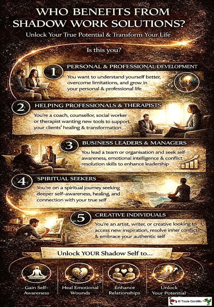 Become an expert in evidence-based shadow work through Dr Toula Gordillo’s learning and teaching organisation: Shadow Work Solutions