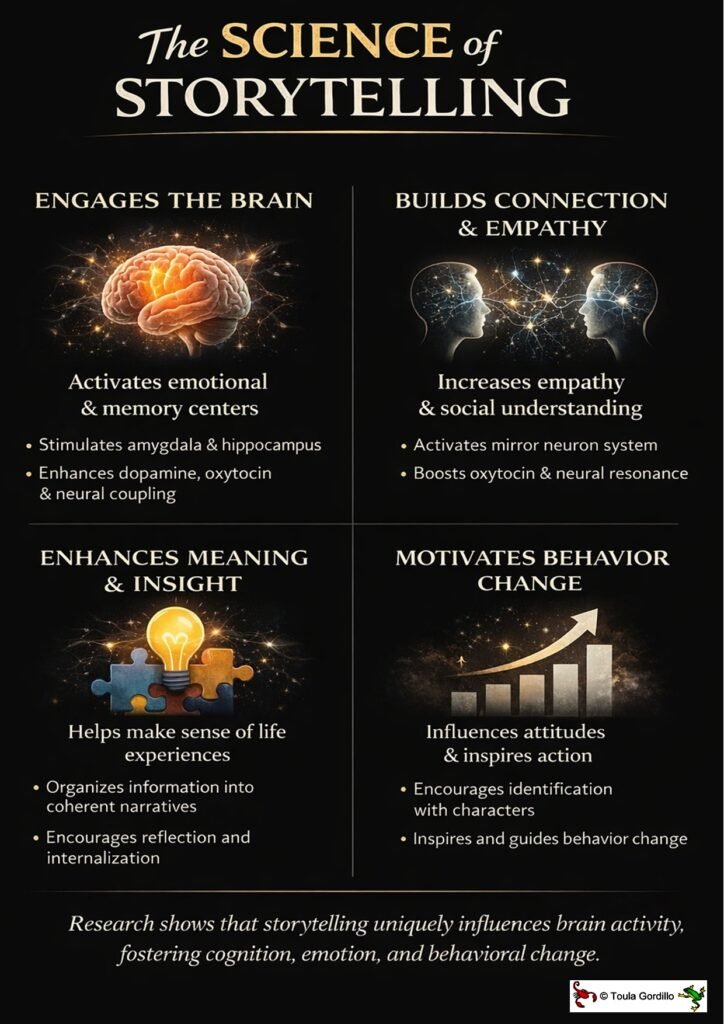 Stories are powerful because the brain understands life through images, emotions and meaning — not just facts. When we hear a story, areas linked to memory and empathy are activated, making insights easier to remember and feel. Storytelling also connects us to the ancestral wisdom (and wounds) carried within us.