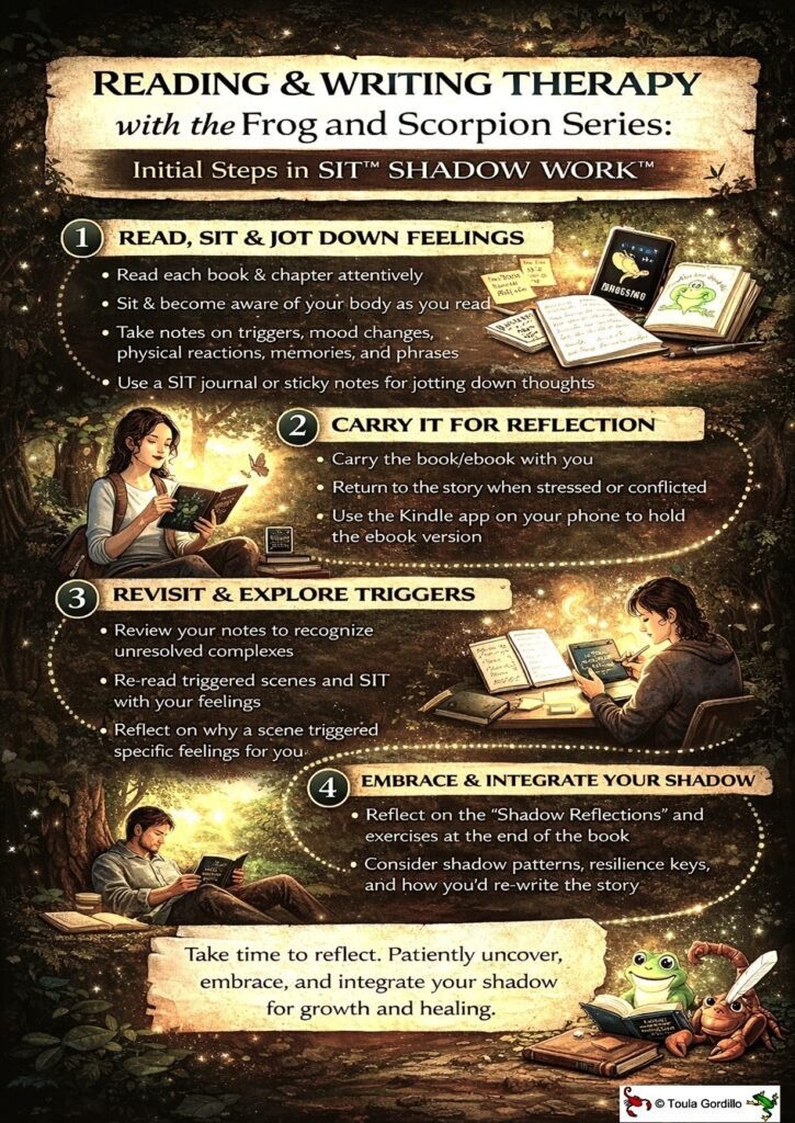 The Frog and Scorpion SIT series by Dr Toula Gordillo is used in Story Image Therapy to support self-reflection and emotional growth. Each book can be read alone, but the series works best when read together and guided by a trained SIT coach, counsellor or therapist.