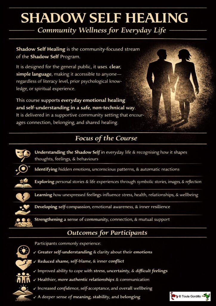 This community-focused course is designed for everyday people to recognise and heal their personal complexes. Using Story Image Therapy (SIT®), Jungian depth psychology, symbolic stories, images and guided reflection, participants are gently supported to explore their Shadow Self in a way that feels safe, simple and non-technical.